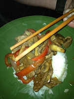 Finally he wanders back to the doorway (his work is done, I guess). I remove the veggies, let the pan heat up again and sear the beef slices, then throw the veggies back in at the last minute to mix it all together. The rice is done, and he's still on the phone, so I dish out my own, leaving his plate on the counter, turn off the stove, and make my way past him again to my spot on the couch to eat.